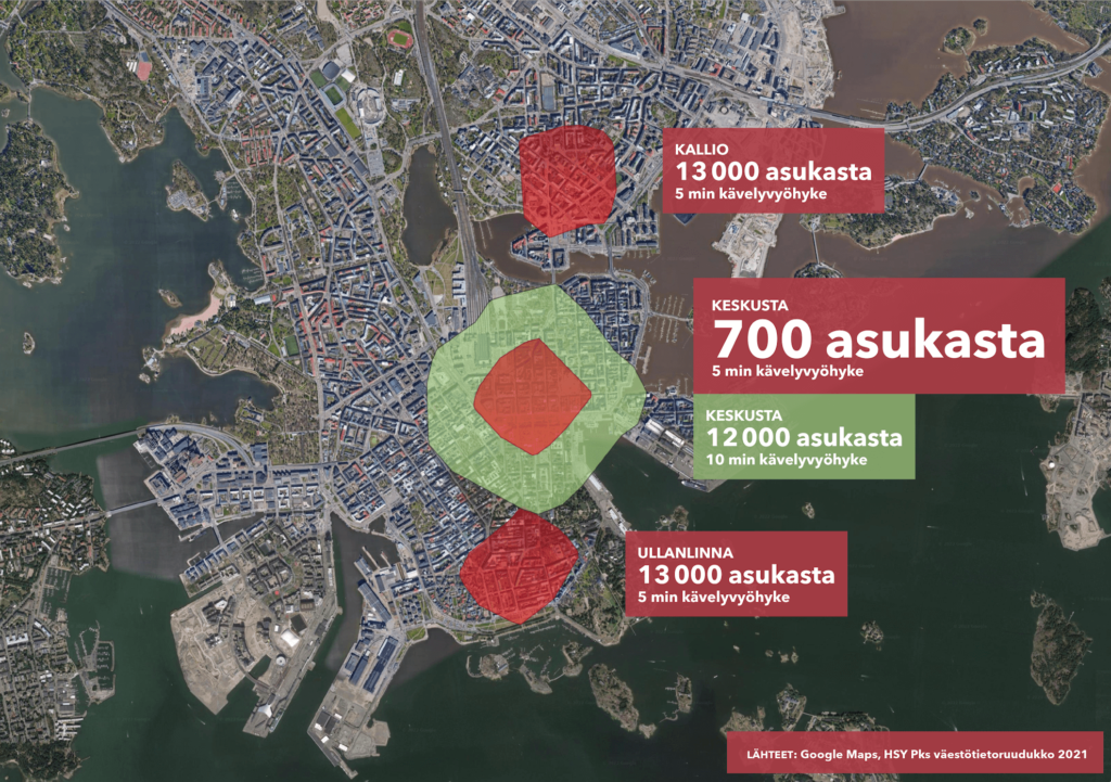 Etusivu Ajankohtaista Blogi Helsingin ydinkeskusta tarvitsee asukkaita Helsingin ydinkeskusta tarvitsee asukkaita 16.11.2022 Timo Hämäläinen Kirjoittajan muut artikkelit Helsingin keskustan tulevaisuudesta on tullut ajankohtainen kaupunkikehittämisen puheenaihe. Koronapandemia antoi vauhtia ilmiöille, joiden pelätään vavisuttavan kaupungin ytimen elävyyttä akuutin kriisin jälkeenkin. Etätyön läpilyönti on vähentänyt päivittäistä palvelukysyntää ja saanut yritykset uudelleenarvioimaan toimitilatarpeitaan. Turistilaumat ovat harventuneet samalla kun verkkokauppa haastaa kaupan nykykonseptit. Vierailijavirtojen houkuttelua takaisin keskustaan eivät helpota viime vuosina kantakaupungin laidalle rakennetut suuret kauppakeskukset, joista löytyvät monet täsmälleen samat palvelut kuin ytimestäkin. Uhkakuvat ovat saaneet Helsingin kaupungin sisällyttämään ydinkeskustan kehittämisen yhdeksi strategiseksi painopisteekseen. Elinvoimatekojakin on jo näköpiirissä. Kaupunkiympäristölautakunta hyväksyi juuri kokeilun parantaa keskustan viihtyisyyttä laajentamalla Esplanadien jalkakäytäviä. Kuvateksti: Julkinen keskustelu Helsingin keskustan elinvoimasta on myös ollut vilkasta. Kannanotoissa on ehdotettu muun muassa keskustan katujen kattamista ja maksuttomien oleskelupaikkojen lisäämistä. Eräät tahot puolestaan sitkeästi uskovat ratkaisun löytyvän maksuttoman pysäköinnin lisäämisestä ja autoilun helpottamisesta. Kuva: Timo Hämäläinen Suunta on oikea Mullistuneessa maailmassa tarvitaan juuri tämänkaltaisia raikkaita avauksia, jotka tuottavat kaupunkiseudun asukkaille ja vierailijoille syitä tulla keskustaan. Elämykset, kulttuuri ja kohtaamiset ovat yhä merkittävämpi osa ihmisten kaupunkikulutusta. Panostukset katutilan monikäyttöisyyteen ja pehmentämiseen viherrakentamisella sekä kulttuuritapahtumat ovat sitä keinovalikoimaa, joiden avulla terävöitetään ydinkeskustan lumovoimaa viihteen, kulttuurin, taiteen ja moninaisten elämysten arvaamattomana tiivistymänä. Mutta riittävätkö nämäkään toimenpiteet pitämään Helsingin sydämen sykkimässä kaikkina vuorokauden- ja vuodenaikoina? Eivät välttämättä. Oma näkemykseni on, että kaupunkikeskustojen eläväisyyden kehittämisessä oleellinen kulmakivi on asumisen lisääminen. Samalla kun koronatoimet hiljensivät Helsingin keskustan, elettiin monessa kantakaupungin kaupunginosassa lähes päinvastaisessa tilanteessa. Katuelämä säilyi vilkkaana erilaisista sulkutiloista huolimatta, kun ihmiset puikkelehtivat kotitoimistoiltaan moninaisiin tapaamisiin ja askareisiin tai vähintään ulkoilemaan. Näin jatkuu edelleen. Elävien katujen ja asiakasvirtojen riittävyyden on taannut vankka asukaspohja. Tiheimmin asutuissa kaupunginosissa, kuten Kalliossa ja Ullanlinna-Punavuoressa, voi asua viiden minuutin kävelyvyöhykkeellä jopa yli 13 000 asukasta. *Asukasluvut on laskettu niistä 250 m x 250 m väestötietoruuduista, joita vyöhykkeet selkeästi koskettavat. Ydinkeskustassa kotitoimistolta lounaalle poikkeamisia ei juuri nähty, sillä alue on yhtä harvaan asuttu kuin keskimääräinen maaseudun kirkonkylä. Keskeltä Aleksanterinkatua mitatulla viiden minuutin kävelyvyöhykkeellä asuu ainoastaan noin 700 vakituista asukasta. Vasta laajentamalla mittakaavaa kymmenen minuutin vyöhykkeeksi päästään lähelle Kallion ja Ullanlinna-Punavuori-akselin viiden minuutin vyöhykkeen asukasmääriä. Helsingin keskustan ominaispiirre onkin, että siellä sijaitsee laajalla alueella lähinnä työpaikkoja, palveluja ja kulttuuri-instituutioita. Sinne saavutaan ja sieltä lähdetään. Suuremmassa mittakaavassa saman kokemuksen löytää pohjoisamerikkalaisten kaupunkien Central Business Districteilta, jotka muuttuvat iltaisin aavemaisen tyhjiksi ihmisten kaikottua esikaupunkeihin. Helsingin kantakaupungin asukkaat ovat pakkautuneet muualle kuin ydinkeskustaan. Kauppatorilta lähtevä lähes asumaton vyöhyke jatkuu pohjoiseen Pasilaan saakka. Lähde: OpenStreetMap, HSY Pks väestötietoruudukko 2020. Mahdollisuuksien maailmoja keskusta-asumiseen Pandemian vauhdittamat voimat avaavat kiehtovan mahdollisuuden kehittää keskustaa toiminnoiltaan sekoittuneemman kaupunkirakenteen suuntaan. Etätyön aiheuttaman elämän asuinalueille ”paikallistumisen” taustalla vaikuttaa pidempi trendi, jossa työn ja vapaa-ajan välinen raja hämärtyy ja perinteinen ”ysistä viiteen” -työpäivä väistyy. Niissä paikoissa on imua, missä ihmisten on helppo integroida vapaa-ajan rientonsa saumattomasti työn ympärille. Ydinkeskusta tarvitsee siis omat paikallisasukkaansa elävyyden turvaamiseksi ja laajentamiseksi. Jokainen uusi keskusta-alueen asukas auttaa ylläpitämään ympärillään rikasta palvelumaailmaa kuten muualta kantakaupungista voidaan nähdä. Ja siihen tulisi päälle vielä muualta paikalle pendelöivien vastaava vaikutus. Ajatus samanaikaisesta asumisen lisäämisestä ja riittävien toimitilatarpeiden turvaamisesta on kuitenkin suuri haaste kaupunkisuunnittelulle. Agendalle olisi otettava reipas uusien asuntojen kaavoittaminen vajaakäyttöisille alueille, käyttötarkoitusten muutokset ja rakennusten hybridikäytön edistäminen. Olemassa olevien rakennusten täyttä tai osittaista uusimista tuskin voitaisiin välttää. Muutosten arvioinnissa olisi nostettava kaupunkielämä yhdenvertaiseksi tavoitteeksi konservoinnin rinnalle. Mahdollisuuksien maailmoja keskusta-asumisen lisäämiseksi kannattaa vähintään tutkia tarkemmin. Siten saattaa löytyä ratkaiseva palanen pitkälle tulevaisuuteen kantavan keskustan eläväisyyttä vahvistavan kierteen syntyyn. asuminen helsinki ydinkeskusta Jaa hyvää Share to: facebook Share to: linkedin Share to: twitter
