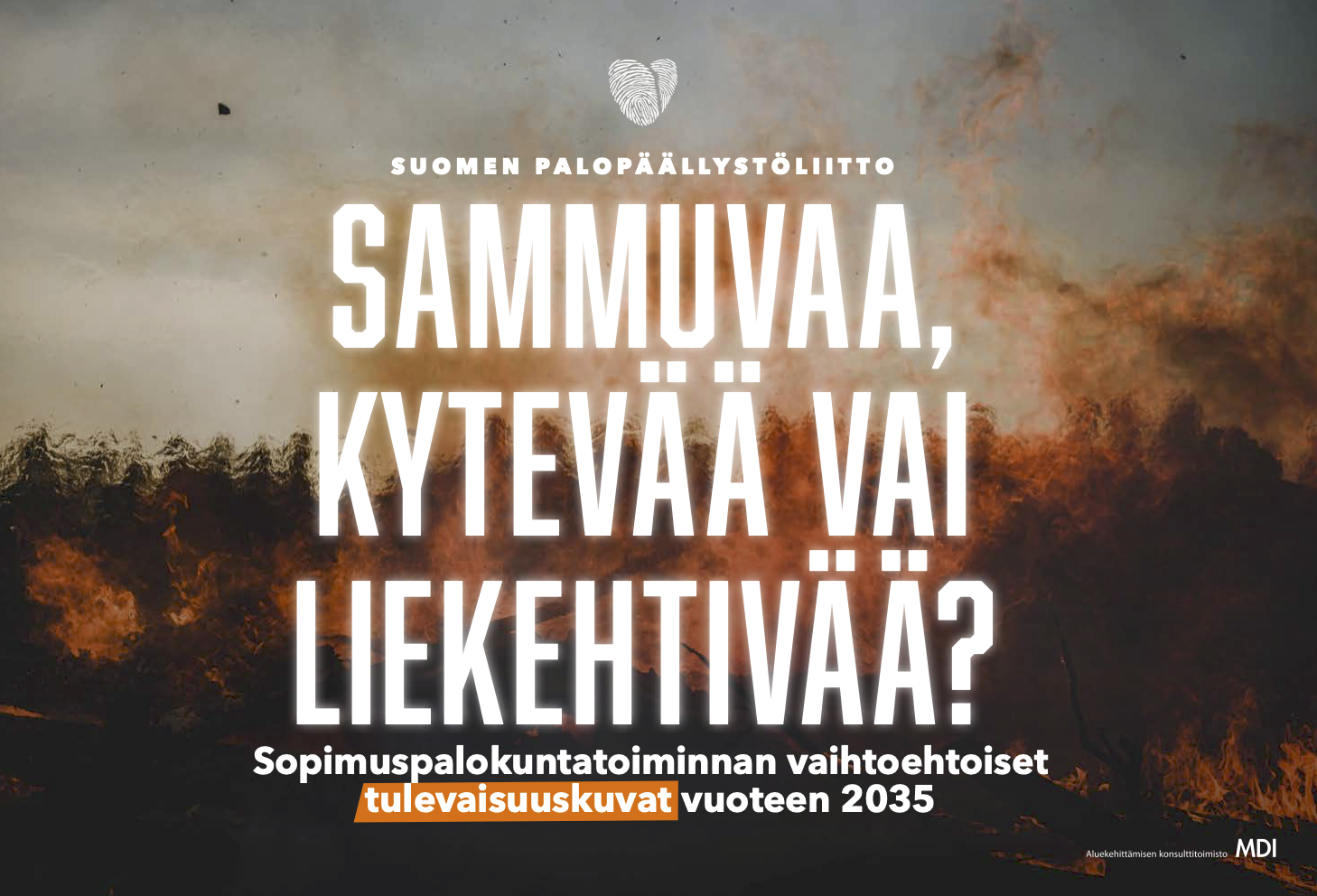 Etusivu Ajankohtaista Uutiset Sopimuspalokuntatoiminnan tulevaisuuskatsaus esittää vaihtoehtoiset tulevaisuuskuvat vuoteen 2035 Sopimuspalokuntatoiminnan tulevaisuuskatsaus esittää vaihtoehtoiset tulevaisuuskuvat vuoteen 2035 7.5.2021 Sopimuspalokuntien tulevaisuuskatsaus Sammuvaa, kytevää vai liekehtivää? – Sopimuspalokuntatoiminnan vaihtoehtoiset tulevaisuuskuvat vuoteen 2035 tarkastelee sopimuspalokuntatoiminnan nykytilaa ja tulevaisuuden skenaarioita. Sammuvaa, kytevää vai liekehtivää? Lue raportti Issuussa klikkamalla kuvaa. Kuva ja taitto: Anssi Kumpula. Sopimuspalokunnilla on merkittävä rooli osana suomalaista pelastustoimen järjestelmää, joka on parhaillaan keskellä historiallista uudistusta. Samalla esimerkiksi väestö- ja aluerakenteen kehitys sekä muutokset työelämässä ja vapaa-ajalla asettavat omat haasteensa sopimuspalokuntien toimintaan. – Tulevaisuustarkastelussa oli tavoitteena tarkastella monipuolisesti sopimuspalokuntatoiminnan nykytilaa ja rakentaa skenaariot, jotka huomioivat toiminnan monimuotoisuuden. Skenaariotyöllä voidaan tukea sopimuspalokuntatoiminnan kehittämistä tulevaisuussuuntautuneesti, kertoo asiantuntija ja hankkeen projektipäällikkö Henrika Ruokonen MDI:stä. Tutkimus luo pohjaa yhteiskunnalliselle keskustelulle ja tukee päätöksentekoa. Raportissa kuvataan kolme vaihtoehtoista tulevaisuuskuvaa sopimuspalokuntatoiminnalle ja se esittää viisi johtopäätöstä ja kehitämissuositusta. MDI toteutti tutkimuksen yhteistyössä Juha Heikkala Consultingin kanssa Suomen Palopäällystöliitolle, ja sitä rahoitti Palosuojelurahasto. Materiaalit Tiedote: Sammuvaa, kytevää vai liekehtivää? Sopimuspalokuntien tulevaisuuskatsaus on julkaistu Policy brief: Sopimuspalokuntatoiminnan tulevaisuudessa tilausta joustaville toimintatavoille, yhteistyölle ja suunnitelmalliselle kehittämiselle Julkistamistilaisuuden tallenne (YouTube) Podcast: Näkökulmia sopimuspalokuntien tulevaisuuteen skenaariot sopimuspalokunnat tulevaisuuskatsaus Jaa hyvää Share to: facebook Share to: linkedin Share to: twitter